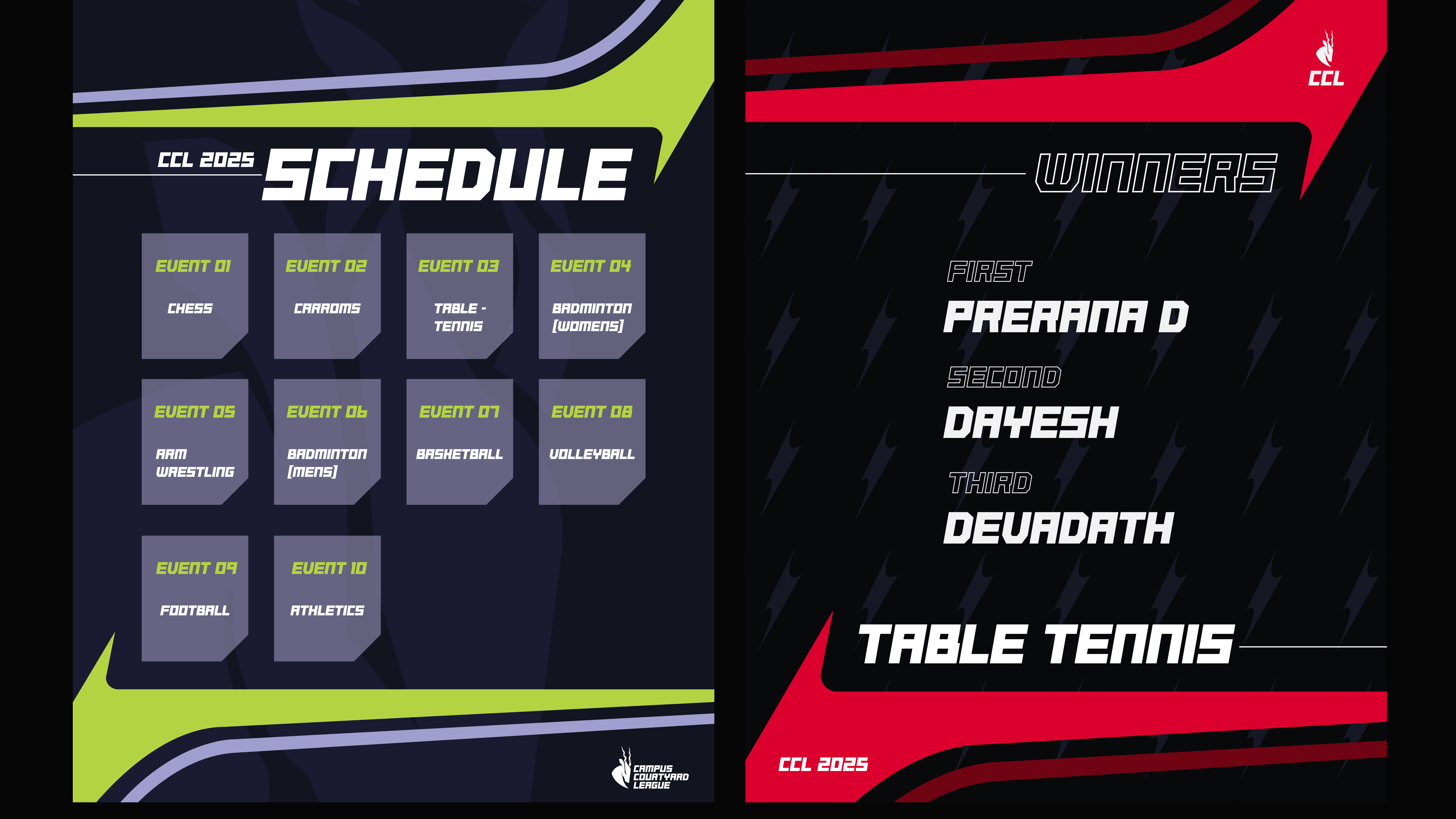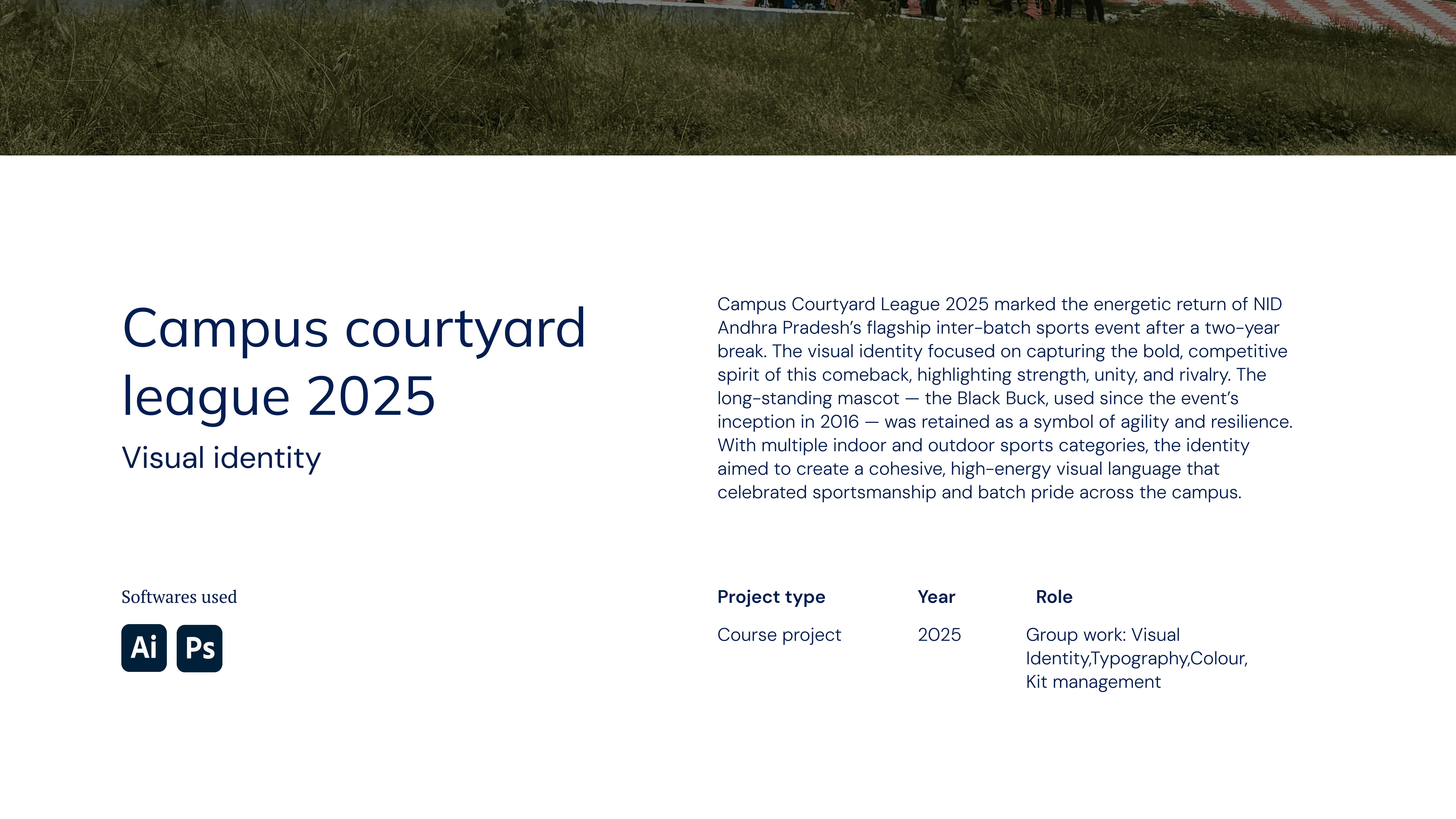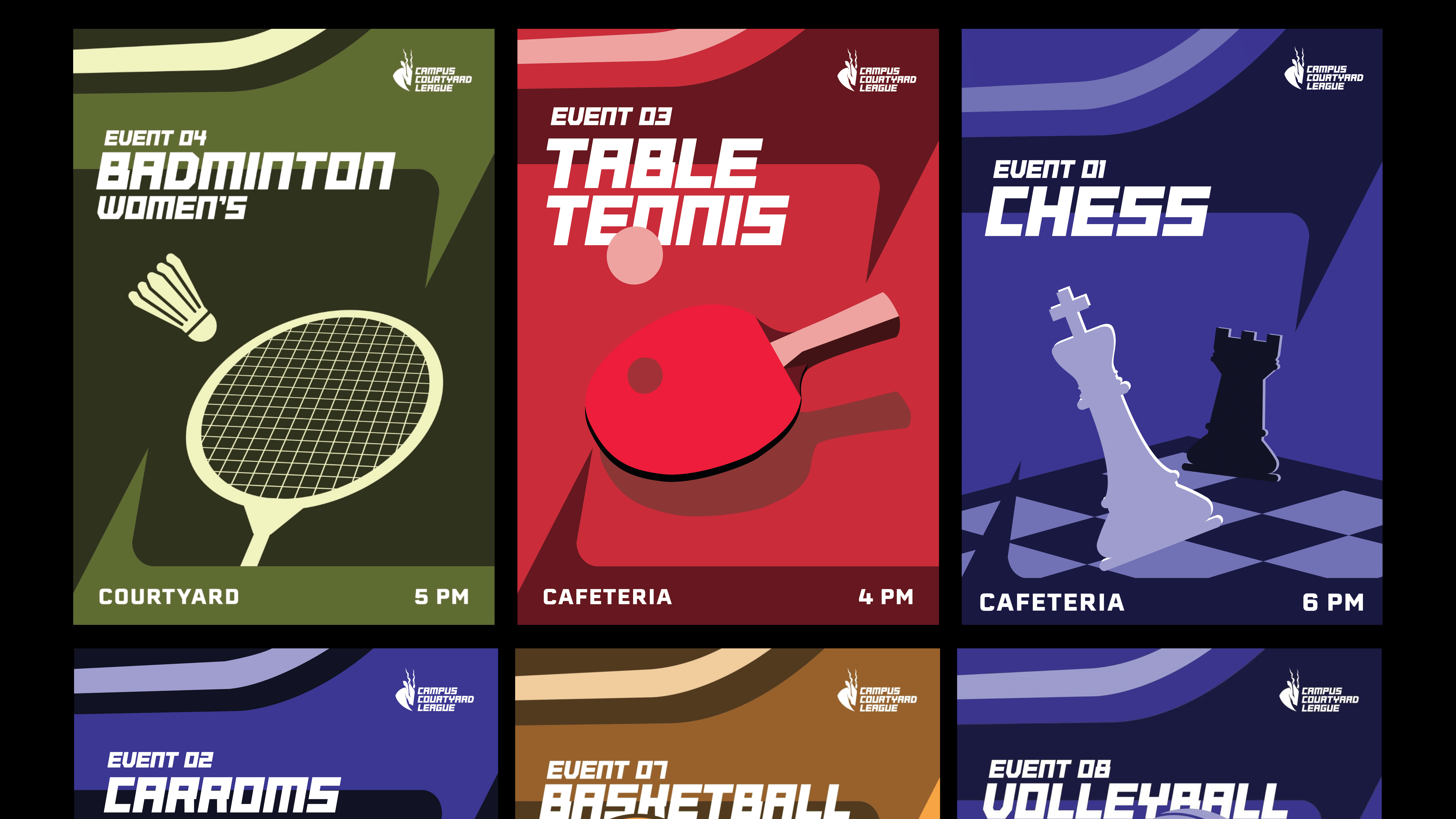 Campus Courtyard League 2025 is the annual sports event at the National Institute of Design, Andhra Pradesh, celebrating energy, teamwork, and campus spirit. The project focused on creating a bold and cohesive visual identity that could scale across kits, posters, digital assets, and on-ground applications. My contribution involved developing the core visual language—colour palette, typography, and style concept along with designing sports kits and managing the consistent application of the identity across all touchpoints.