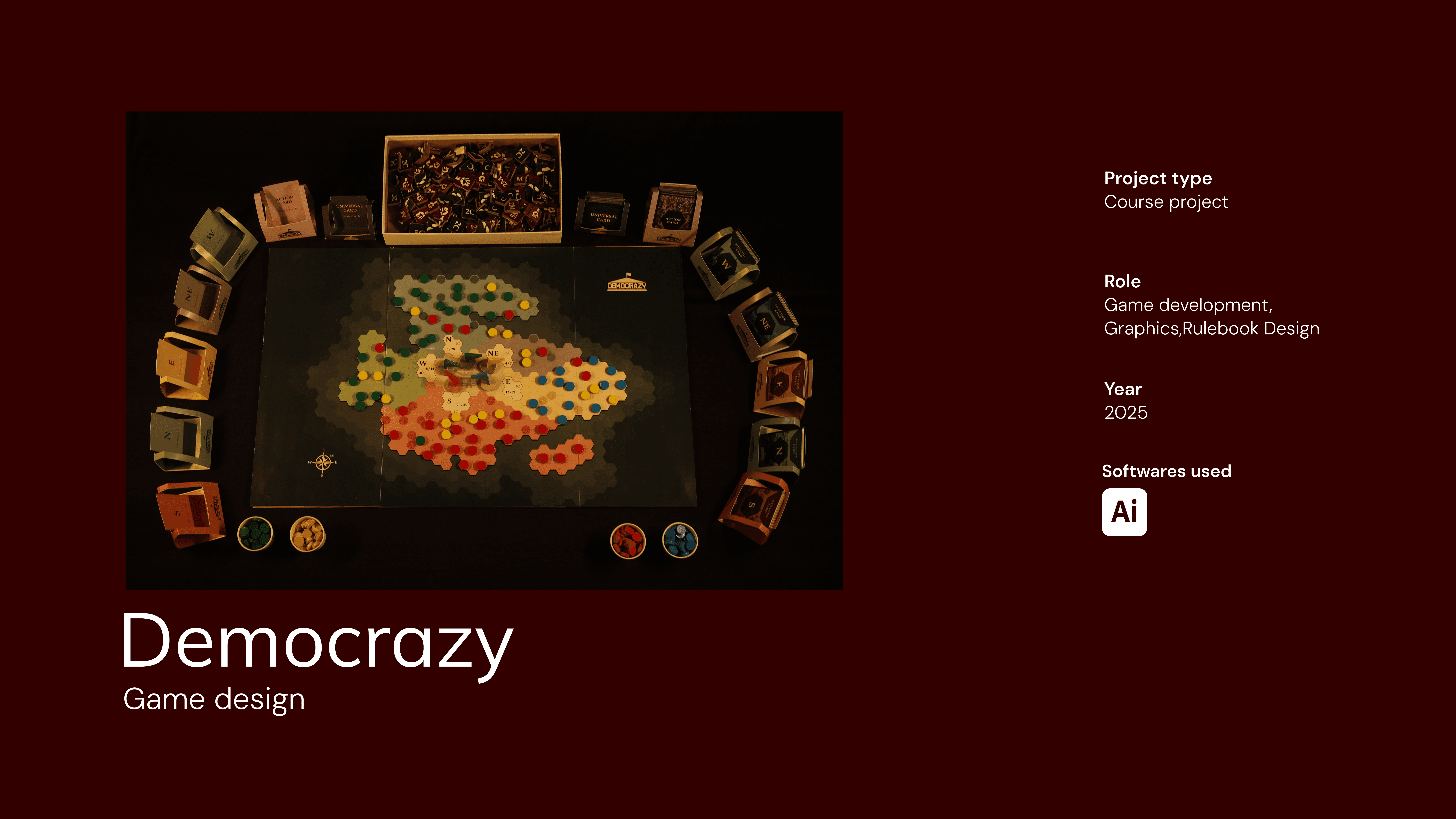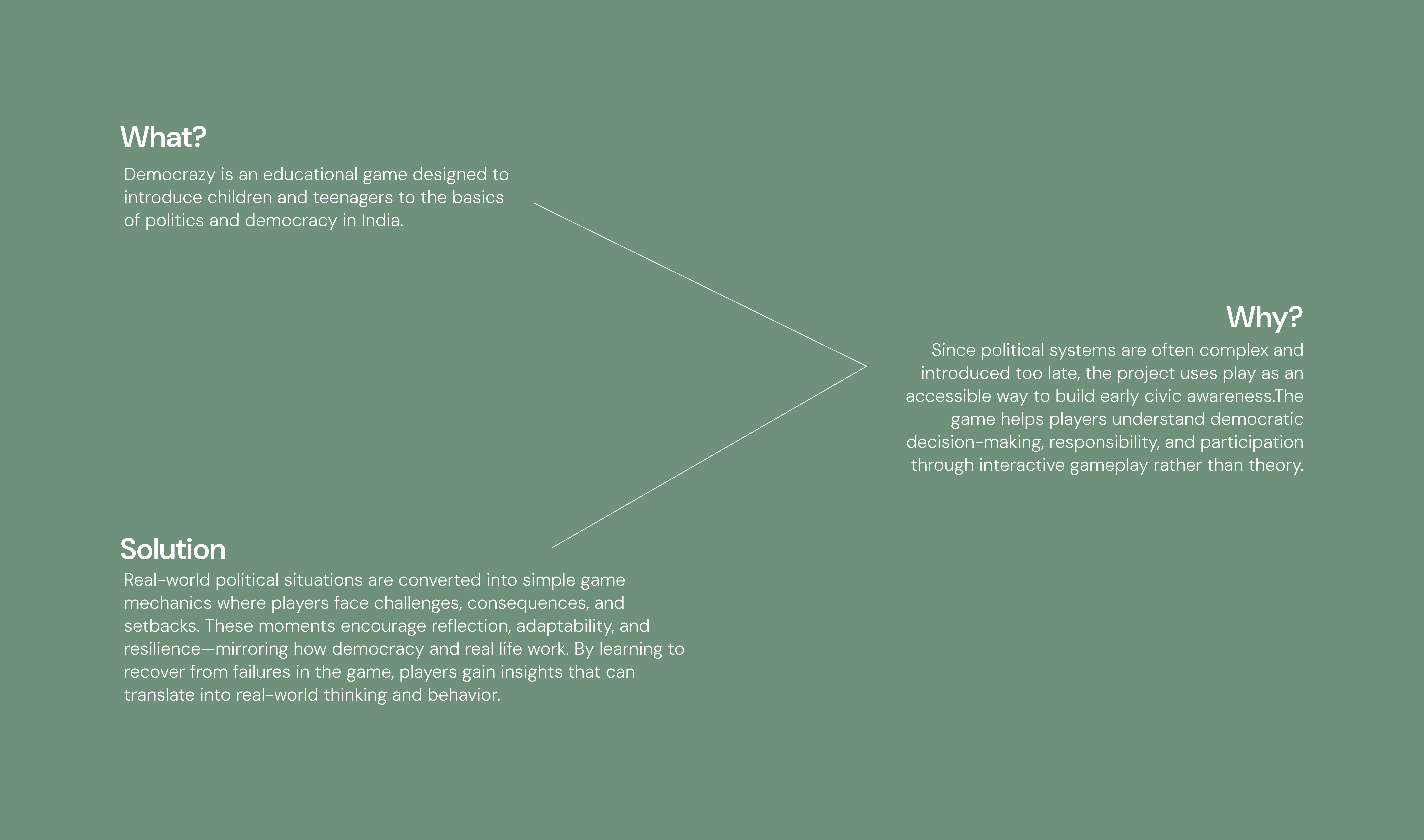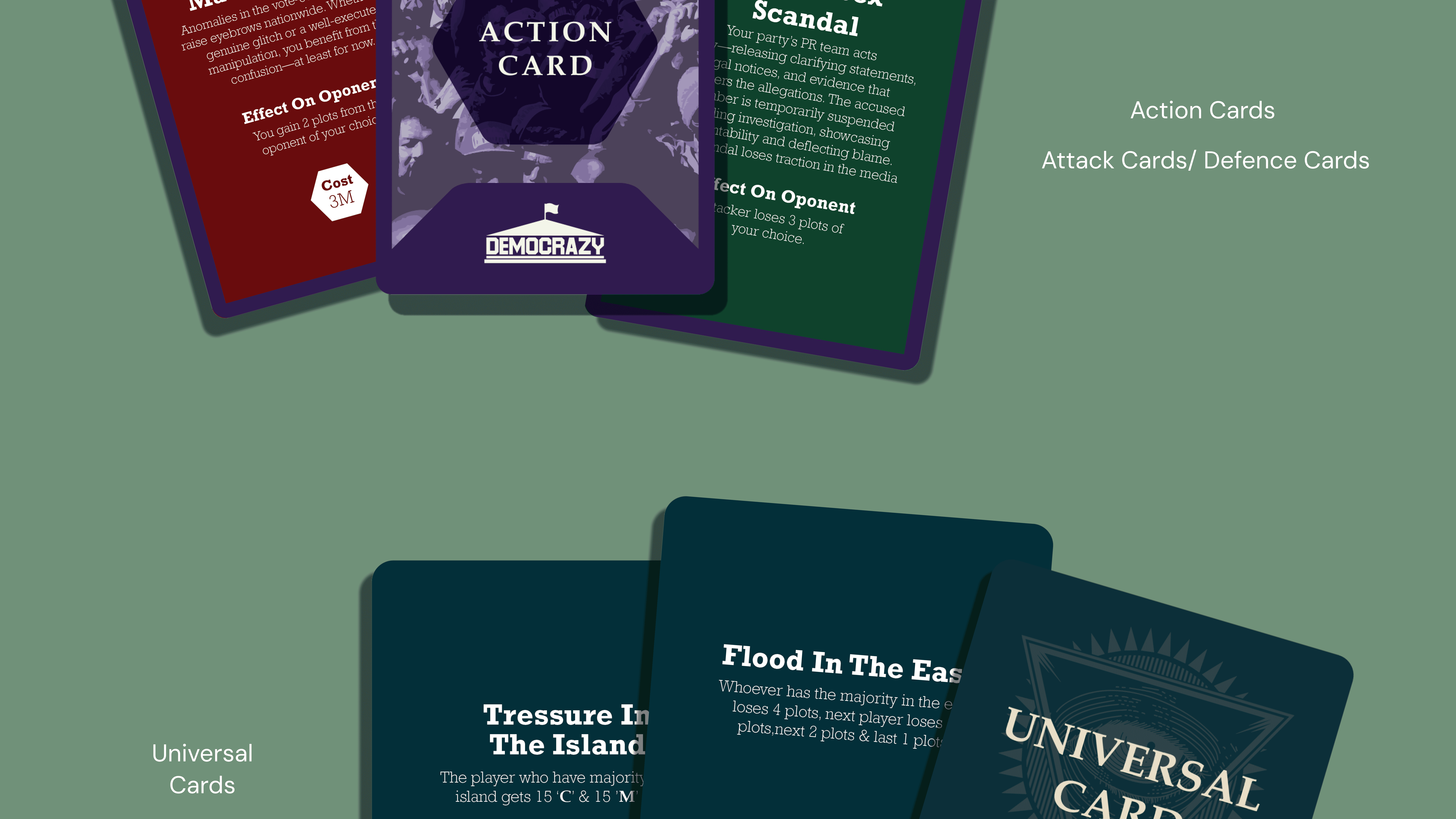 Democrazy is an educational game that introduces children and teenagers to the basics of politics and how democracy works in India through interactive play. It simplifies complex civic concepts into clear game mechanics where players make decisions, face consequences, and learn to recover from setbacks reflecting real-life democratic participation. Designed with a strong focus on visual clarity and accessibility, the project uses intuitive gameplay and a flow-based rulebook to make political learning engaging, understandable, and age-appropriate.