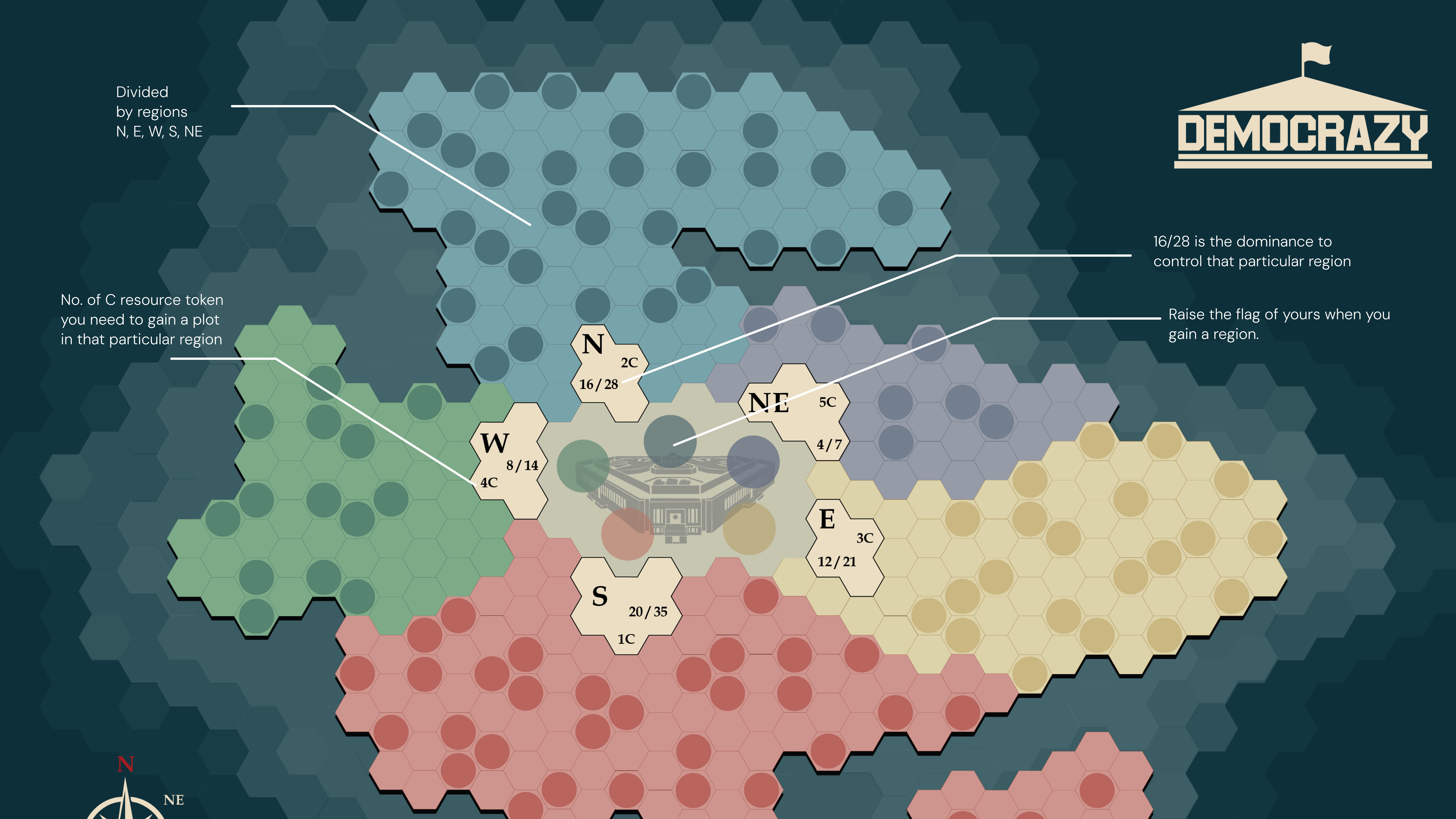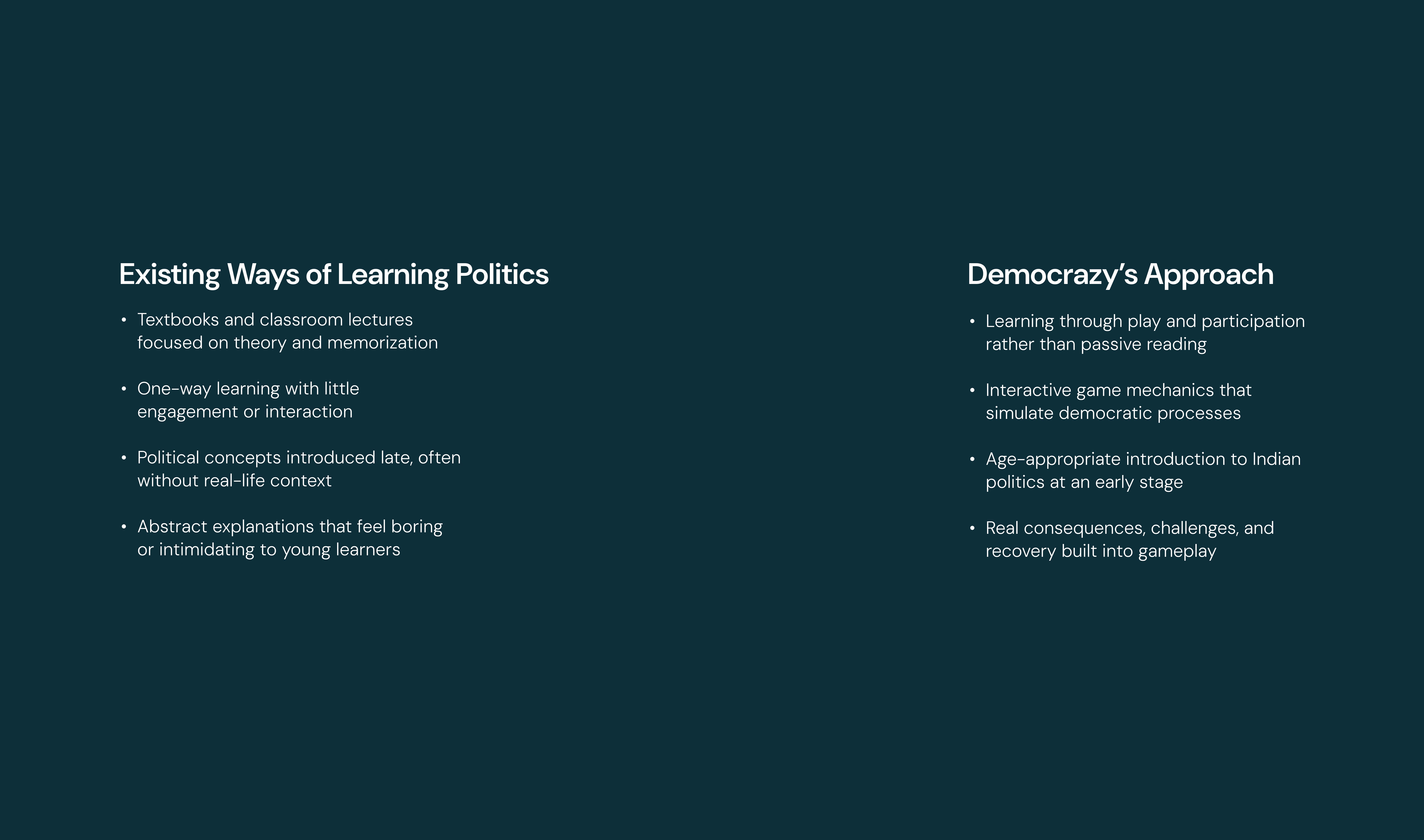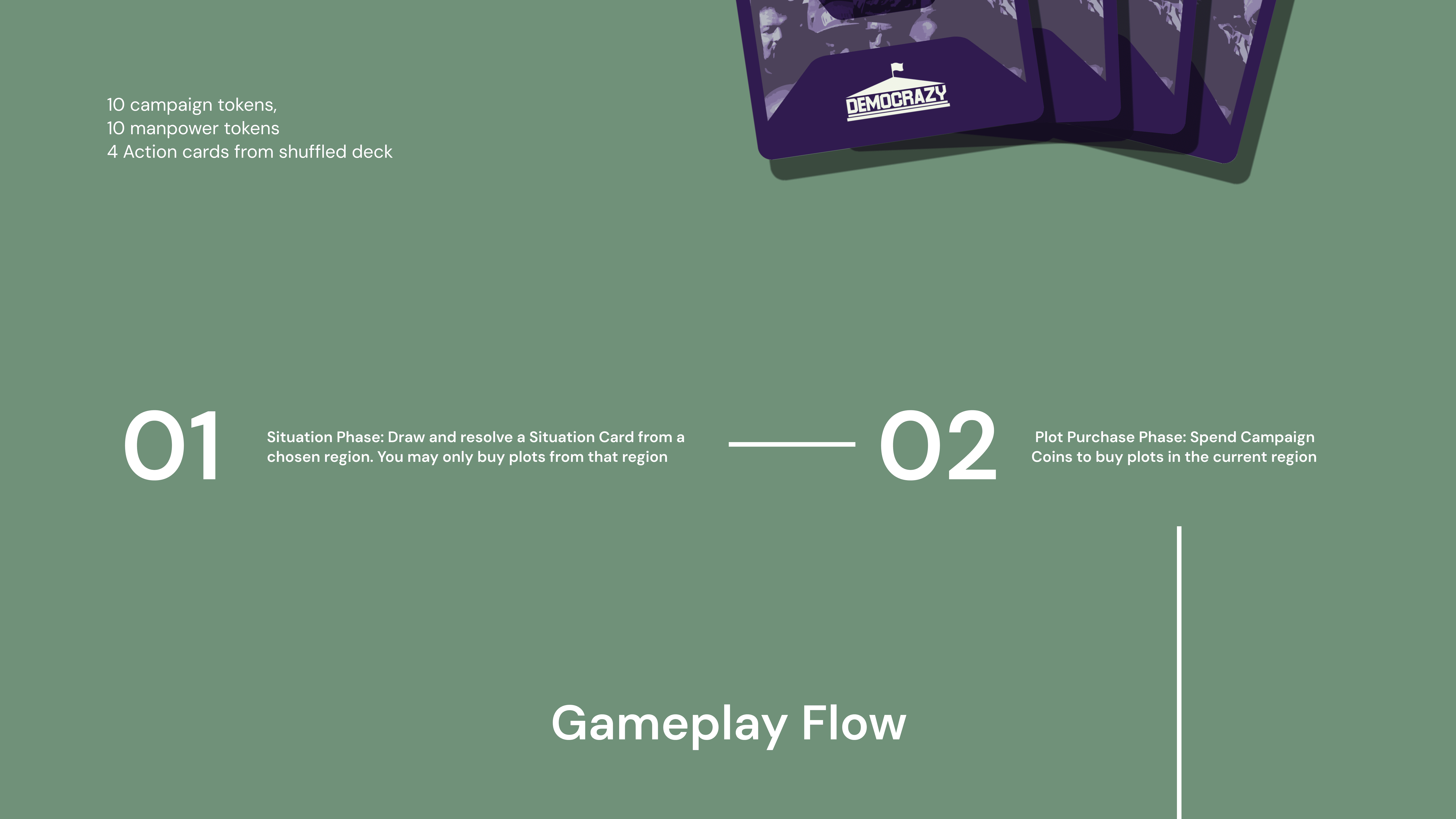 Democrazy is an educational game that introduces children and teenagers to the basics of politics and how democracy works in India through interactive play. It simplifies complex civic concepts into clear game mechanics where players make decisions, face consequences, and learn to recover from setbacks reflecting real-life democratic participation. Designed with a strong focus on visual clarity and accessibility, the project uses intuitive gameplay and a flow-based rulebook to make political learning engaging, understandable, and age-appropriate.